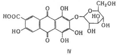 Многие ароматич. красители природные обладают физиол. активностью, напр. куркумин, коферменты типа убихинона (2,3-диме-токси-5-метил-6-полиизопренил-1,4-бензохиноны), витамины группы К - противовоспалит. действием. К частично гидрированным ароматич. красителям природным относятся антибиотики группы тетрациклина и хромомицина, окрашенные в желтый цвет. Нек-рые из красителей этого ряда все еще применяют для крашения; напр., в реставрац. работах используют ализарин-осн. красящее в-во краппа, или марены красильной (Rubia tinctorum), содержащее также пурпурин (1,2,4- тригидроксиантрахинон) - красный краситель, к-рый применяют в гистохимии для выявления Са в замороженных средах, а также как реактив на В и F- в аналит. химии: картамин (2',3',4,4',6'-пентагидроксихалкон) - желтый краситель пыльцы цветов сафлора красильного (Carthamus tinctorius); кармин, выделяемый из кошенили (самок насекомых кактусовая ложнощитовка; Coccus cacti) и применяемый в пищ. и парфюм. пром-стях. Действующее начало кармина - карминовая к-та (гликозид тетрагидроксикарбоксиантрахинона; IV); ее применяют в цитологии.