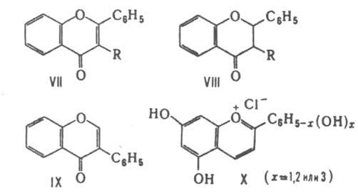 наиб. широко представлены желтые красители природные-гидрокси-, метокси- и метилендигидроксипроизводные 4-хромона и хромена. К ним относятся флавоноиды - производные флавона (VII; R=Н), флавонола (VII; R=ОН), флаванона (VIII; R=Н) и флаванонола (VIII; R=ОН), изофлавона (IX), а также антоцианидины (X), окрашивающие цветы, ягоды, плоды и овощи в красный, фиолетовый, синий и черный цвета. В природе флавоноиды существуют в виде агликонов и гликозидов, антоцианидины - только в виде гликозидов (антоцианов). Многие из них обладают антимикробным действием, а кверцетин, его 3-О-рамнозид (кверцитрин) и 3-О-рамноглюкозид (рутин) относятся к группе витамина Р. Гликозид датистицина (2',3,5,7 - тетрагидроксифлавона) используют, напр., для окраски эритроцитов и тромбоцитов, а также возбудителей сибирской язвы, стафилококкоза и др. заболеваний у с.-х. животных при исследованиях методами микроскопии.