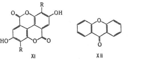 Среди красителей природных зтой группы имеются: производные кумарина, такие, как эллаговая к-та (XI; R=ОН), широко распространенная в древесине мн. пород, напр. квебрахо Колорадо (Quebracho Colorado), и ее диметиловый эфир (XI; R=ОСН3), встречающийся в корнях рода молочая (Euphorbia formosana), и др.; производные ксантона (XII) - красители желтого цвета, напр. гентизин (1,7-дигидрокси-З-метокси-ксантон), раневелин (1,4,8-тригидрокси-З-метилксантон).