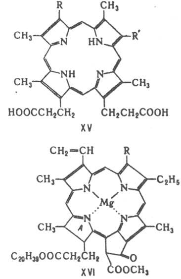 Азотсодержащие гетероциклы. К производным индола относятся наиб. древние красители природные -индиго и пурпур античный. Производные пиррола включают три важные группы красителей: 1. Красный пигмент эритроцитов крови гемоглобин-железосодержащий комплекс протопорфирина IX (XV; R=R'=СН=СН2) и белка глобина. В природе встречается ряд аналогов протопорфирина IX; наиб. близки ему по строению хлорокруопорфирин (XV; R=СНО, R'=CH=CH2) - простетич. группа пигмента хлорокруорина, содержащегося в крови червей Spirographis, и мсзопорфирин IX (XV; R=R'=C2H5), встречающийся в амбре. 2. Пигменты зеленых частей растений, содержащиеся в хлоропластах наряду с каротиноидами (в соотношении 3:1), - сине-зелeный хлорофилл а (XVI; R=СН3) и желто-зеленый хлорофилл б (XVI; R=СНО), играющие важную роль в процессах фотосинтеза (см. Хлорофиллы). Кроме того, в растениях содержится также протохлорофилл а (кольцо