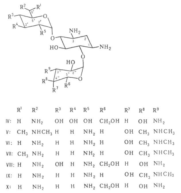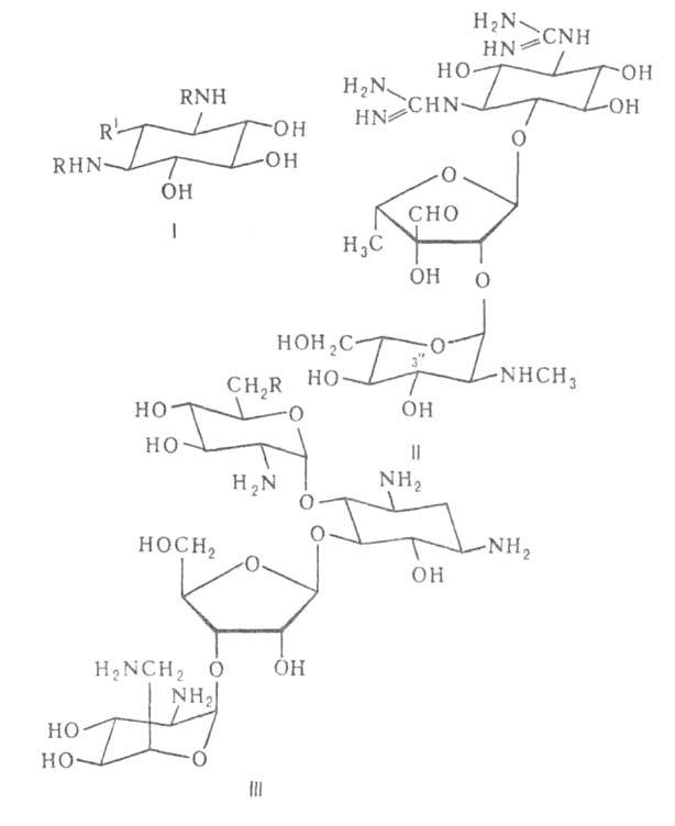 Наиб. значение имеют производные стрептидина [ф-ла I; R = C(NH2)=NH, R' = OH] и 2-дезоксистрептамина (I; R = R' = Н). Важнейшие из них перечислены в таблице.