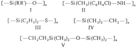 Кремнийорганические полимеры, основные цепи к-рых построены из чередующихся атомов Si и О, наз. полиорганосилоксанами, напр. полидиметилсилоксан (ф-ла I; R=R'=СНД полиметил(фенил)- силоксан (I; R=CH3, R'=С6Н5). Кремнийорганические полимеры, в основных цепях к-рых чередуются атомы Si и N или Si и S, называют соотв. полиорганосилазанами, напр. полиметил (4-хлорфенил) силазан (II), и полиорганосилтианами, напр. полидиэтилсилатиан (III). Поликарбосиланы имеют основные цепи, состоящие из чередующихся атомов Si и С, напр. полидиметилсилиленметилен (IV). Известны также полисилоксаноалкилены, напр. политетраметилдисилоксаноэтилен (V).