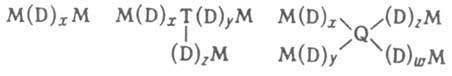 (М, D, Т и Q-соотв. моно-, ди-, три- и тетрафункциональные звенья; индекс 0,5 у атома О показывает, что этот атом является общим для данного и соседнего атомов Si). Кремнийорганические полимеры, макромолекулы к-рых состоят в осн. из звеньев М и D, являются кремнийорг. жидкостями; строение их можно представить след. образом: