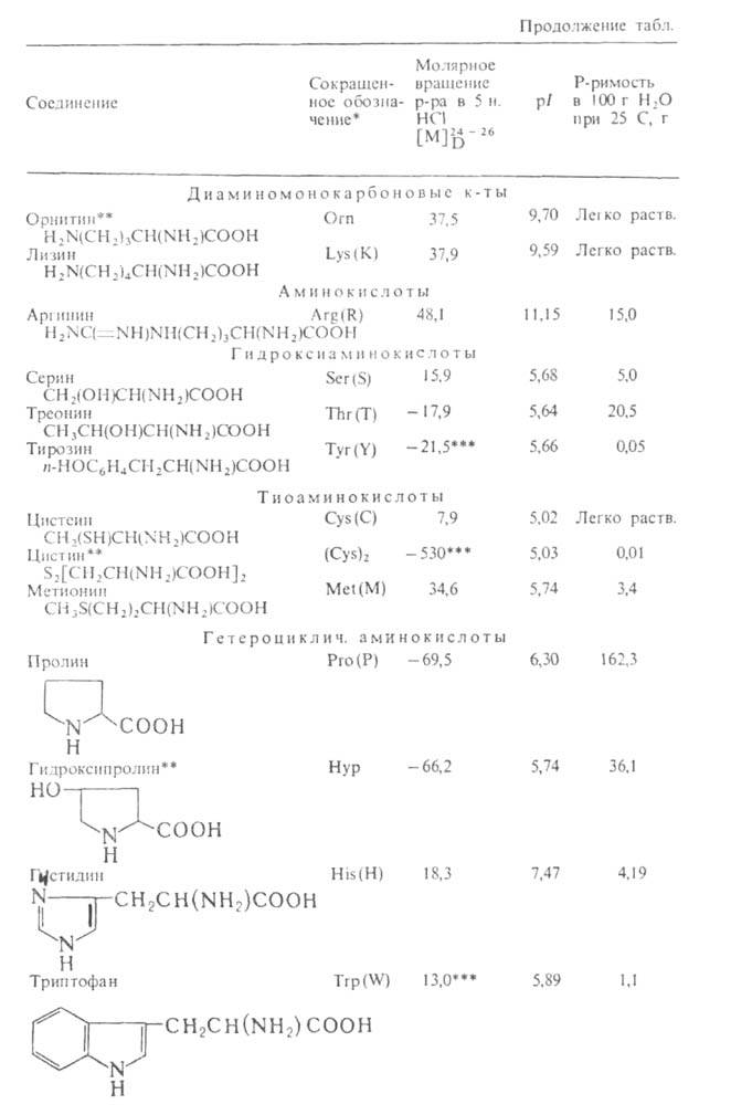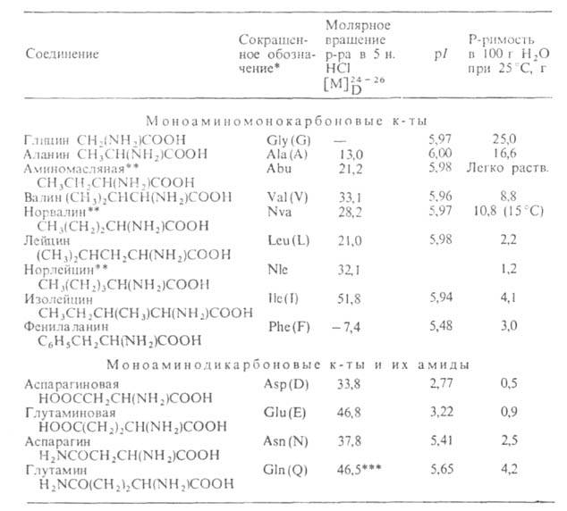 * В скобках дается однобукв. обозначение аминокислот, рекомендуемое ИЮПАК. ** Некодируемые аминокислоты: остальные кодируются генетич. кодом. *** Р-р в 1 н. НС1.