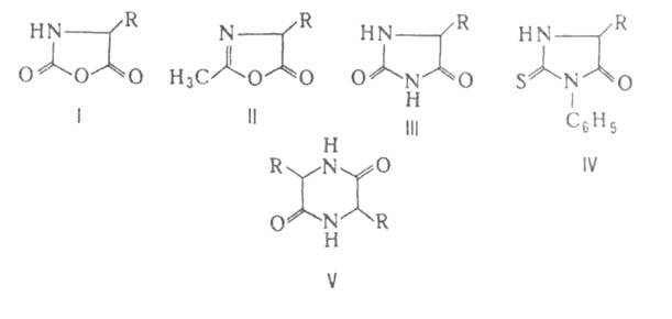 . превращаются в циклич. ангидриды N-карбоксиаминокислот (ф-ла I), а при нагр. с уксусным ангидридом или ацетилхлоридом - в азлактоны (II); нагревание аминокислот с мочевиной или обработка изоцианатами дает гидантоины (III), а при использовании