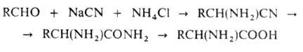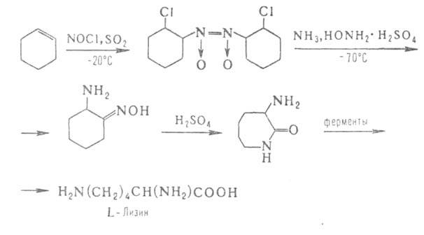 аминокислоты ввиду сложности синтеза и разделения оптич. изомеров получают микробиол. способом (лизин, триптофан, треонин) или выделяют из гидролизатов прир. белковых продуктов (пролин, цистин, аргинин, гистидин). Перспективны смешанные химически-ферментативные способы синтеза, напр.: