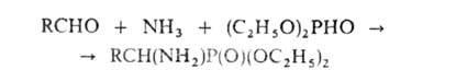 В этой р-ции вместо альдегидов м. б. использованы кетоны, а вместо диалкилфосфитов - диалкилтиофосфиты, кислые эфиры алкил(арил)фосфонистых к-т RP(OH)OR и диарилфосфиноксиды Аr2НРО. Таким путем получен широкий набор комплексонов.