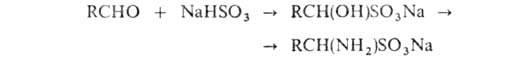 Аминосульфоновые к-ты получают при обработке аммиаком продуктов присоединения NaHSO3 к альдегидам: