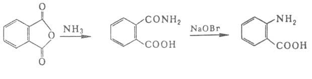 Ароматические аминокислоты синтезируют восстановлением нитробензойных к-т или окислением толуидинов после предварит. бензоилирования аминогруппы. Антраниловую к-ту получают из фталевого ангидрида:
