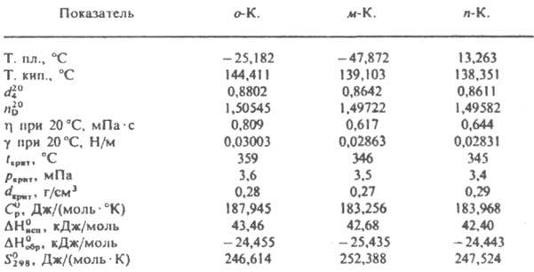 КСИЛОЛЫ (диметилбензолы) (СН3)2С6Н4, мол. м. 106,16; бесцв. жидкости (табл. 1) с запахом бензола. Смешиваются с этанолом, диэтиловым эфиром, ацетоном, хлороформом, бензолом; р-римость в воде менее 0,015%.Табл. 1. - СВОЙСТВА КСИЛОЛОВ