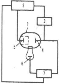 Рис. 1. Схема установки для прямой кулономeтрии при постоянном E: 1 электролизер; 2 источник постоянного токa с регулируемым напряжением: 3 прибор для определения кол-ва злектричества: 4 рабочий электрод; 5 вспомогательный электрод; 6 электрод сравнения, относительно к-рого контролируют потенциал рабочего электрода: 7 устройство, измеряющее разность потенциалов.