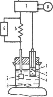 Рис. 2. Схема установки для кулонометрического титрования: 1 электролизер: 2 рабочий электрод (электрод генерации): 3 - вспомогательный электрод: 4 пористое стекло: 5 прецизионное сопротивление: 6 устройство, измеряющее разность потенциалов: 7 источник постоянного тока: 8 хронометр: 9 магнитная мешалка.