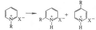 Р-цию осуществляют при 200-300 °С в среде пиридина или без него. При т-ре, превышающей 300 °С, происходит расщепление цикла. Обычно в Ладенбурга реакци 2- и 4-замещенные пиридиния образуются в соотношении ~2:1; 3-замещенные производные получаются в незначительных кол-вах. Выход продуктов ок. 75%. Присутствие кислотных катализаторов способствует протеканию изомеризации в положение 2. Изомеризация йодистого N-пропилпиридиния приводит к смеси солей изопропилпиридиния с преим. содержанием 2-изопропилпиридиния. В Ладенбурга реакцю вступают также производные хинолина и изохинолина. Р-ция открыта А. Ладенбургом в 1883. Лит.. Брестер Дж. X., Элиель Э. Л., в кн.: Органические реакции, пер. с англ., сб. 7, М., 1956, с. 177; Общая органическая химия, пер. с англ., т. 8, М., 1985. с. 53 54. Г. Л. Мищенко.