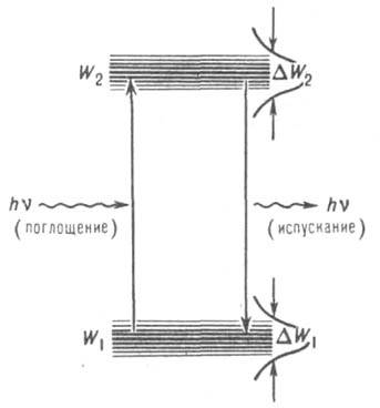 Рис. 1. Энергетические уровни квантовой системы, используемой в качестве активной среды лазера. DW2 и DW1 - ширины энергетич. состояний W2 и W1, обычно определяемые по полуспаду плотности состояний. Показаны переходы, соответствующие поглощению и испусканию фотона hv.