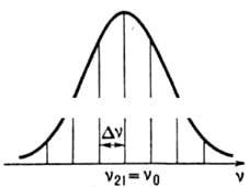 Рис. 2. Спектральная линия активной среды лазера. S(v, v21) -относит. число спонтанно испущенных фотонов на частоте v'; v21 - резонансная частота, Dvл - полуширина спектральной линии.