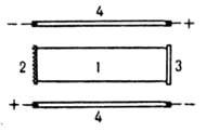 Рис. 4. Простейшая схема лазера: 1 - активная среда; 2 - непрозрачное зеркало; 3 - частично прозрачное зеркало, через которое осуществляется вывод генерируемого излучения; 4 - система накачки (здесь - газоразрядные лампы).