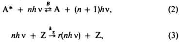 где g и g* - статистич. веса соответствующих состояний; B, kZ, kQ и kM - константы скорости процессов (2), (3), (4) и (5) соответственно. Их значения легко связать с сечением s, параметрами резонатора L и r, св-вами активного в-ва, способом накачки; тогда ур-ния (6) выражают осн. энергетич. соотношения при генерации лазера когерентного излучения. Они позволяют применять для расчетов методы, разработанные для нелинейных хим. процессов (см. Неравновесная химическая кинетика).