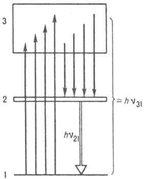 Рис. 5. Принципиальная схема энергетических уровней рубина. Стрелками вверх указано поглощение энергии накачки hv31, стрелками вниз - безызлучат. переходы. Двойная линия - лазерный переход на частоте v2l.