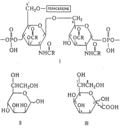 В молекулах липополисахаридов гладких штаммов (S-форм) выделяют три различные по структуре участка: липид А, центр. олигосахаридный участок (кор) и О-специфический полисахарид. В шероховатых мутантах (R-формах) полисахаридная цепь отсутствует, а кор м. б. короче, чем в S-формах. Липид А - наиб. консервативная часть липополисахаридов и имеет сходную структуру у большинства изученных микроорганизмов. Его основу составляет обычно дисахарид, построенный из двух (b-1 : 6-связанных остатков D-глюкозамина, фосфорилированных в положения 1 и 4' (ф-ла I). Обе аминогруппы и часть гидроксильных групп ацилированы высшими жирными к-тами (до С26), обычно насыщенными и неразветвленными, а также их 3-гидрокси- и 3-ацилоксипроизводными (реже др. производными к-т). Определенный качеств. состав жирных к-т характерен для целых родов и даже семейств бактерий и служит одним из таксономич. критериев.