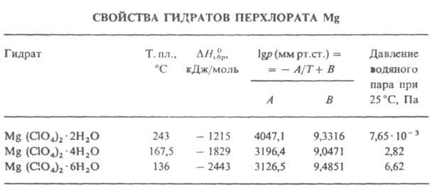 МАГНИЯ ПЕРХЛОРАТ Mg(ClO4)2, бесцв. кристаллы; очень гигроскопичны; плотн. 2,614 г/см3; С0р 186,0 Дж/(моль.К); DH0обр -569,6 кДж/моль; S0298 210,5 Дж/(моль.К); существует в неск. кристаллич. модификациях, т-ра перехода a D b ок. 100°С, DH0 перехода 2,72 кДж/моль. Ниже 300 °С магния перхлорат термически устойчив, медленно распадается выше 350°С, быстро - в интервале 440-500 °С; конечные продукты распада О2, Сl2 и MgO, промежуточный - MgCl2. Образует три инконгруэнтно плавящихся гидрата (см. табл.). Хорошо раств. в воде и орг. р-рителях, при 25 °С р-римость (г в 100 г р-рителя): в воде 99,6, этаноле 24,0, метаноле 51,8, гидразине 69,0, ацетоне 42,9. Из водных р-ров в интервале концентраций от 43,5 до 65,3% по массе и т-р от —67 до 136°С кристаллизуется гексагидрат. Магния перхлорат образует устойчивые твердые сольваты с NH3, N2H4, NH2OH, пиридином, метанолом, диоксаном и др. электронодонорными молекулами. Конц. р-ры магния перхлората в орг. р-рителях и сольваты с молекулами восстановителей взрывоопасны. С перхлоратами щелочных металлов и др. однозарядных катионов магния перхлорат образует комплексы M[Mg(ClO4)3]. Получают магния перхлорат взаимод. р-ра НСlO4 с MgCO3 или Mg(OH)2 с послед. кристаллизацией в виде гексагидрата.