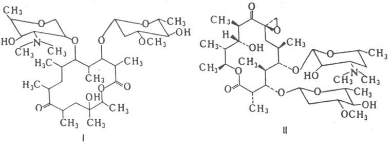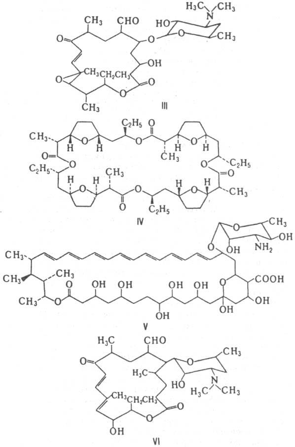 Многие макролиды продуцируются штаммами бактерий, в осн. актиномицетами и стрептомицетами. Из таких макролидов наиб. распространены эритромицин, олеандомицин, розамицин и тетранактин (ф-лы, соотв., I-IV), продуцируемые штаммами Streptomyces erythreus, Streptomyces antibioticus и родственными им организмами. Штаммами Streptomyces noursei, Actinomices levoris Krass, Actinomyces nodosus и др. продуцируются полиеновые макролиды, такие, как нистатин, леворин, амфотерицин В (ф-ла V) и др. Большинство макролидов, продуцируемых бактериями, представляют собой макролидные или полиеновые антибиотики.