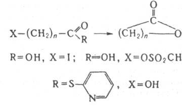 Из культуральных фильтратов такие макролиды выделяют экстракцией орг. р-рителями и очищают хроматографич. методами. Известны также макролиды, продуцируемые бактериями, а затем трансформированные хим. или биохим. путем, напр. триацетилолеандомицин и нек-рые модифицир. эритромицины. Хим. путем обычно синтезируют незамещенные макролиды. Их получают лактонизацией w-галогенокислот или разл. эфиров гидроксикислот, напр.: