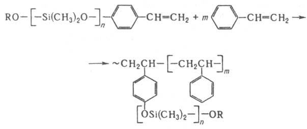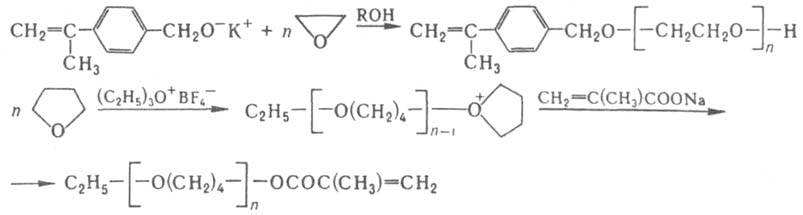 (кат. - К; т-ра 180°С). Поликонденсацию и полиприсоединение редко используют для синтеза макромономеров. Для количеств. характеристики макромономеров применяют обычные методы анализа функциональности полимеров. При гомополимеризации макромономеров образуются регулярные гребнеобразные полимеры, при сополимеризации с "малыми" мономерами - привитые сополимеры, напр.: