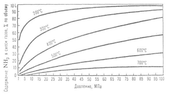 NH3. Сдвигу равновесия вправо способствуют повышение давления и понижение т-ры (см. рис. 2). Тепловой эффект р-ции при 29,4 МПа составляет 52,38 кДж/моль при 500°С и 51,29 кДж/моль при 400°С (с учетом теплоты смешения газов). Процесс проводят в присут. кат.- Fe, активированного К2О, А12О3, СаО и др. Каталитич. яды - сернистые и кислородсодержащие соединения. Для известных катализаторов скорость р-ции описывается ур-нием Темкина - Пыжева: