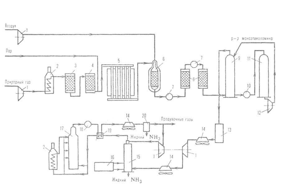 Рис. 3. Агрегат синтеза аммиака мощностью 1360 т/сут: 1-компрессоры; 2-подогреватели; 3-аппарат для тарирования сераорг. соед.; 4-адсорбер H2S; 5-трубчатая печь (первичный риформинг); 6-шахтный конвертор (вторичный риформинг); 7-паровые котлы; 8-конверторы СО; 9-абсорбер СО2; 10-кипятильник; 11 -регенератор р-ра моноэтаноламина; 12-насос; 13-аппарат для гидрирования остаточных СО и СО2; 14-воздушные холодильники; 15-конденсац. колонна; 16-испаритель жидкого NH3 (для охлаждения газа и выделения NH3); 17-колонна синтеза NН3; 18-водоподогреватель; 19-теплообменник; 20-сепаратор.