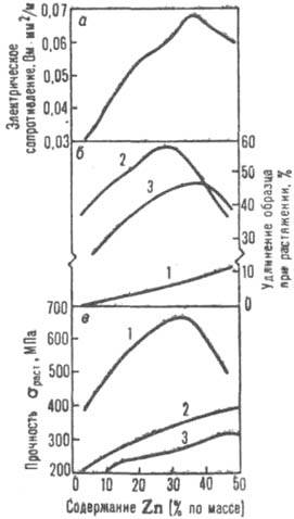 Зависимость электрического сопротивления (а), пластичности (б)и прочности (в) латуней от содержания Сu в сплаве: 1 - наклепанная латунь; 2 -отожженная латунь; 3 - литая латунь. К медно-никелевым сплавам относятся мельхиоры (содержат 20-30% Ni и легирующие элементы Fe, Mn и др.), нейзильбер (5-35% Ni, 12-46% Zn), константан (40% Ni, 1,5% Mn), манганин (30% Ni, 12% Mn) и др. Никель образует с медью непрерывный ряд твердых р-ров, его введение повышает коррозионную стойкость, твердость, прочность, модуль упругости и т-ру плавления сплава, понижает его теплопроводность, электрич. проводимость и температурный коэф. электрич. сопротивления. Медноникелевые сплавы обрабатывают давлением в горячем и холодном состоянии. Применяют в кораблестроении, для изготовления деталей, работающих при повышенной т-ре и давлении. Все меди сплавы обладают высокой стойкостью против атмосферной и газовой коррозии. Для латуней, нейзильбера, бериллиевых и др. бронз она составляет (0,5-30).10-4 мм в год. Существенно замедляют их окисление Be, Zn и Al, способствующие образованию на поверхности сплава защитной пленки; заметно уменьшают коррозию также Si, Sn, Zn, Cd; не влияют - Fe, Ni, Co, Mn, Sb, Ag, P; присутствие в сплаве Сr, Se, As ускоряет его окисление. Меди сплавы устойчивы в атмосфере СО2, сухого NH3, незагрязненного сухого и влажного водяного пара. При длительной (десятки лет) атмосферной коррозии латунь подвергается обесцинкованию. Этот процесс протекает вследствие селективной коррозии Zn или перехода в результате коррозии в р-р Сu и Zn с послед. осаждением Сu в сплаве. При этом наблюдается сохранение медного остова, изделие не меняет своей формы, но утрачивает прочность. Латуни с повыш. содержанием Zn наиб. подвержены такому виду коррозии. Склонность меди сплавов к обесцинкованию уменьшается в присут. добавок As (не более 0,5% по массе). Подобная селективная коррозия характерна также для алюминиевых и оловянных бронз. Меди сплавы слабо поддаются почвенной коррозии. Исключение -латуни, к-рые в этих условиях подвержены обесцинкованию. В естеств. водных (речных и морских) средах меди сплавы подвергаются кавитационному разрушению (напр., разрушение корабельных винтов), являющемуся результатом коррозии и действия на сплав высокотурбулентного потока воды. Скорость коррозии в кислотных средах возрастает с повышением т-ры, концентрации к-ты, степени аэрации р-ра и скорости потока. наиб. стойки к к-там оловянные, алюминиевые и кремнистые бронзы, а также медно-никелевые сплавы; применять латуни в контакте с к-тами не рекомендуется. В окислит. средах и горячих щелочных р-рах все меди сплавы быстро разрушаются. Меди сплавы нельзя также использовать в контакте с Н2О2, расплавленной серой, H2S и SO2. Галогены в сухих условиях мало действуют на меди сплавы, но при наличии влаги вызывают коррозию. На пов-сти меди сплавов образуются защитные пленки Cu2O, Cu(OH)2, CuCO3 и др. соед. Сu, слабо р-римых в воде. Это способствует появлению с течением времени на пов-сти т. наз. патины, к-рая придает художеств. изделиям из меди сплавов особый внеш. вид. Специфич. особенность нейзильбера, латуней, бериллиевых, марганцевых и алюминиевых бронз - склонность к коррозии под напряжением, т.е. растрескиванию при одновременном воздействии внеш. сил или остаточных внутр. мех. напряжений и коррозионной среды. Такая коррозия возникает в присут. NH3, паров Hg, р-ров ее солей, в загрязне
