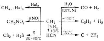 Метан-первый член гомологич. ряда насыщенных углеводородов, наиб. устойчив к хим. воздействиям. Подобно др. алканам вступает в р-ции радикального замещения (гало-генирования, сульфохлорирования, сульфоокисления, нитрования и др.), но обладает меньшей реакц. способностью. Специфична для метана р-ция с парами воды, к-рая протекает на Ni/Al2O3 при 800-900 °С или без катализатора при 1400-1600 °С; образующийся синтез-газ м. б. использован для синтеза метанола, углеводородов, уксусной к-ты, аце-тальдегида и др. продуктов. Нек-рые характерные для метана р-ции приведены на схеме: