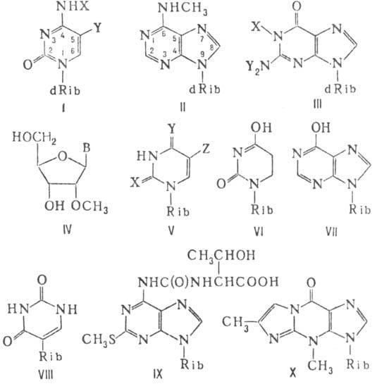 В ДНК растит. и животных тканей встречается, как правило, только 5-мстил-2'-дезоксицитидин (обозначается m5dC; ф-ла I, X = Н, Y = СН3; dRib-остаток 2'-дезокси-рибозы), а у прокариот (бактерии и синезеленые водоросли)-также его изомер (m4dC; ф-ла I, X = СН3, Y = H) и N6-метил-2'-дезоксиаденозин (m6dA; ф-ла II); в меньших кол-вах присутствуют N1-метил- и N2 -диметил-2'-дезоксигуанозин (m1dG и m22dG; ф-ла III, соотв. X = СН3, Y = Н и X = Н, Y = СН3). Единственная отличная от метилирования модификация в ДНК состоит в замене 5-метильной группы тимина в ДНК Т-четных фагов (вирусов бактерий) на гидроксиметильную группу, к-рая м. б. также гликозилирована.