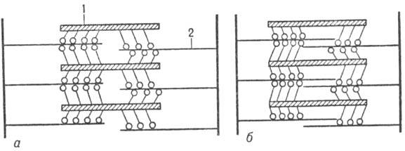 Рис. 3. Схема поперечнополосатой мышцы в покое (а)и при ее сокращении (б); 1 - филаменты миозина; 2 - филаменты актина.