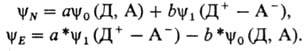 Ф-ция y0 описывает гипотетич. состояние системы "без связи", когда расстояние между молекулами Д и А равно длине донорно-акцепторной связи, а взаимод. между ними только электростатическое. Ф-ция y1 описывает состояние, в к-ром один из электронов с МО донора yД перенесен без изменения спина на МО акцептора yД, оставаясь спаренным со вторым электроном на МО yД, в результате чего образуется ковалентная связь. Суперпозиция гипотетич. состояний, отвечающих y1 и y0, соответствует реальному состоянию молекулярных комплексов.