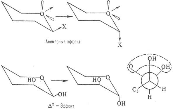 На относит. устойчивость a- и b-форм кроме пространств. факторов влияют диполь-дипольные взаимод.-аномерный эффект, в результате к-рого заместитель при аномерном атоме стремится занять аксиальное положение (особенно в малополярных р-рителях), и дельта2-эффект, заключающийся в повыш. нестабильности конформера с экваториальным заместителем у аномерного атома при наличии аксиального гидроксила в положении 2 (вследствие взаимного отталкивания атомов О; см. ф-лу Ньюмена):