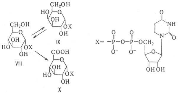 Распад гексоз, окислительный или анаэробный (гликолиз), служит источником энергии для большинства растит. и животных клеток; ферментативные трансформации гексоз приводят к получению др. природных моносахаридов, а при более глубоких превращ. в обмене веществ из них образуются аминокислоты, липиды и др. орг. соединения. В многочисл. р-ции окисления, гликозилирования, восстановления и эпи-меризации под действием соответствующих ферментов моносахариды вступают в виде нуклеозиддифосфатсахаров (НДФС). Так, напр., из уридиндифосфат-D-глюкозы (VIII) могут образовываться уридиндифосфат-D-галактоза (IX) и уридиндифос-фат-D-глюкуроновая к-та (X):