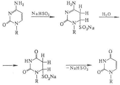 Др. нуклеоф. агенты реагируют аналогично, но константы скорости отдельных стадий могут существенно меняться. Особенность действия бисульфита на ДНК-замена цитози-новых звеньев на урацилъные в результате дезаиминирования цитозина по схеме: