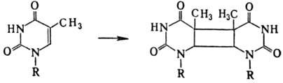 В наиб. степени это относится к тимину, остальные основания более устойчивы. Энергия излучения, поглощенная тимином, локализуется в осн. на двойной связи цикла; следствием этого является образование в составе ДНК димеров: