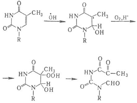 В тимине первичной атаке радикалом ОН. подвергается двойная связь цикла с образованием двух радикалов с радикальными центрами в положениях 5 и 6, с преобладанием первого. В присут. кислорода из радикала образуется гидро-пероксид, к-рый уже при комнатной т-ре разлагается с раскрытием цикла: