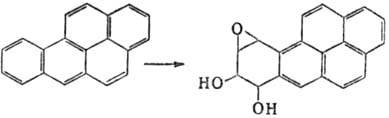 Мутагены химические. Различают мутагены прямого действия -соед., реакц. способность к-рых достаточна для хим. модификации ДНК, РНК и нек-рых белков, и промутагены - в-ва, к-рые сами по себе инертны, но превращ. в организме в мутагены (в осн. в результате ферментативного окисления системой микро-сомных многоцелевых оксидаз). Последние часто называют "конечными" мутагенами. Так, немутагeнный 1,2-бензопкрен (бен-зо[а]пирен) в организме окисляется до 7,8-дигидрокси-9,10-эпокси-7,8,9,10-тетрагидро-1,2-бензопирена, один из стерео-изомеров к-рого обладает мутагенной, а также канцерогенной активностью: