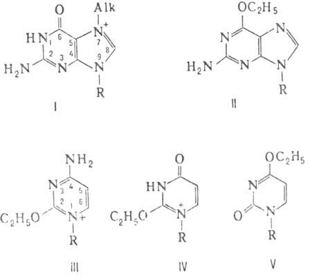 Наибю нуклеоф. центр в молекуле ДНК-положение 7 в гуанине. Поэтому диметилсульфат и метилметансульфоиат (s соотв. 0,9 и 0,86) алкилируют ДНК в осн. по этому положению (см. ф-лу I; везде R-цепь ДНК), а выход продуктов алкилирования центров с меньшей нуклеофильностыо мал. При действии на ДНК этилметансульфоната и N-нитрозо-N-метилмочевины (s соотв. 0,67 и 0,42) доля 7-алкилгуанина в общем выходе продуктов алкилирования снижается и возрастает вклад продуктов алкилирования центров с низкой нуклеофильностью - межнуклеотидных фосфатных групп и атомов кислорода в основаниях. При алкилировании ДНК N-нитрозо-N-этилмочевиной (s ок. 0,26) осн. продукт р-ции -алкилир. остатки фосфорной к-ты и О-алкилир. основания: О6-этилгуанин (II), О2-этилцитозин (III), О2- и О4-этилтимины (соотв. IV и V).