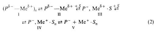 Активные центры анионной полимеризации в подавляющем большинстве случаев инициирования щелочными, щел.-зем. металлами или их соединениями представляют собой производные этих металлов. В зависимости от природы концевого мономерного звена (Р), противоиона (Me+) и р-рителя (S)активные центры могут существовать в виде различающихся по реакц. способности и стереоспецифичности ковалентных поляризованных молекул (ф-ла II), их ассоциатов (I), ионных пар разной степени сольватации (III, IV), своб. анионов Р (V):