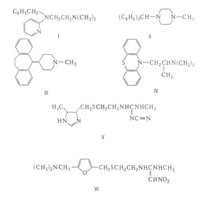 Блокаторы Н2-рецепторов подавляют стимулирующее влияние гистамина на секрецию соляной к-ты желудком. К ним относятся циметидин (V) и ранетидин (VI), к-рые применяют при лечении язвенной болезни желудка и двенадцатиперстной кишки.