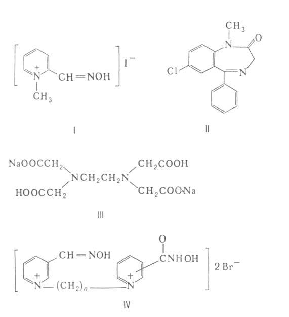 5) Способствующие выведению токсичных соед. из организма, гл. образом комплексоны-тетацинкальций (кальцийдинатриевая соль этилендиаминтетраацетата), трилон Б (III) и др. Эти соед. с катионами тяжелых металлов и нек-рыми РЗЭ образуют устойчивые комплексы, к-рые хорошо раств. в воде и относительно быстро выводятся из организма. Применяются также при поражениях радиоактивными изотопами.