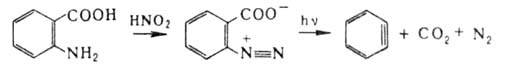 0,5*10-30 Кл*м (25°С, диоксан). Р-римость (г в 100 г р-рителя): в воде - 0,35 (14°С), 90%-ном этаноле - 10,7 (9,6°С), бензоле - 1,8 (12°С), эфире - 16 (6,8°С); хорошо раств. в горячих хлороформе, этаноле, пиридине. Антраниловая кислота амфотерна (Ка 1,07*10-5, Кb1,1*10-12). Ее соли со щелочными металлами, а также минер. к-тами хорошо раств. в воде; р-ры обладают голубой флуоресценцией. При перегонке антраниловая кислота декарбоксилируется до анилина. Она образует с Cd, Co, Сu(II), Ni, Zn, Pb и Hg в уксуснокислых р-рах (рН 2,5-5) внутрикомплексные малорастворимые со-ед., что используется для гравиметрич. определения перечисленных элементов. Диазотирование антраниловой кислоты приводит к о-диазобензойной к-те (является внутр. солью), к-рая при УФ-облучении образует дегидробензол: