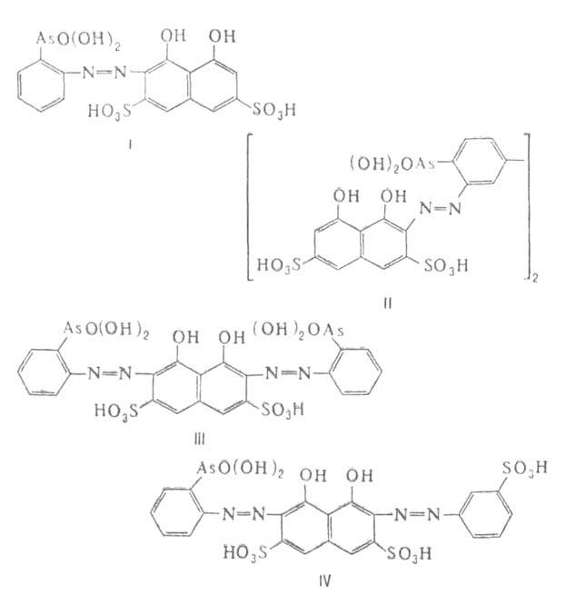 Арсеназо III (3,6-бис-[(2-арсонофенйл)азо]-4,5-дигидрокси-2,7-нафталиндисульфокислота; ф-ла III), мол. м. 776,35. Темно-красное в-во, умеренно раств. в воде, хорошо-в водных р-рах NaHCO3. При рН < 4 окраска водных р-ров розовая или красно-малиновая, при рН > > 5 - фиолетовая или синяя. АрсеназоIII образует с металлами (М) очень прочные комплексы, что позволяет определять их в кислых средах: M(IV) и M(V) - в 6-10 н. HCl или H2SO4, М(II) и М(III) - при рН 1-4. Р-ции комплексообразования контрастны: