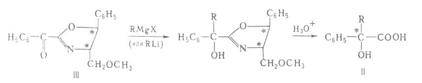гидроксикислот (II) действием магний- или литийорг. соед. на субстраты, в к-рых группа С=О находится в молекуле оптически активного оксазолипового производного (III):