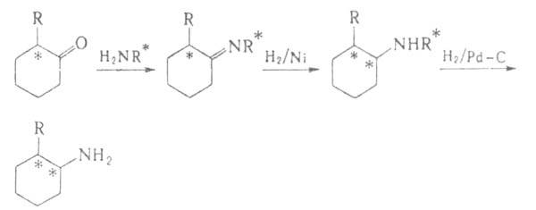 Высокие оптич. выходы достигаются и в др. р-циях карбонильных соед., напр. при альдолъной и кретоновой конденсации. Широко используют в асимметрическом синтезе азометины, енамины, енгидразины, напр.: