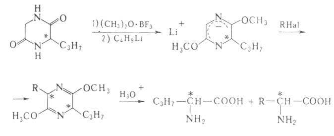 аминокислот, напр. из альдегидов по р-ции Зелинского - Штреккера (с использованием оптически активного амина вместо NH3) или из хиральных дикетопиперазинов (синтезированных из глицина и хиральных аминокислот):