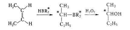 С помощью асимметрического синтеза осуществлены разнообразные р-ции присоединения по связям С=С, напр. р-ция Михаэля, диеновый синтез, аминопалладирование, присоединение литийкупратов LiCuR2. Высокие оптич. выходы (до 100%) достигаются при гидроборировании с помощью моно- или дипинанилборанов (соотв. H2BR* или HBR2*), получаемых взаимод. В2Н6 с (-)-пиненом, напр.: